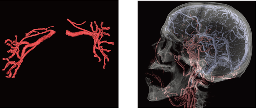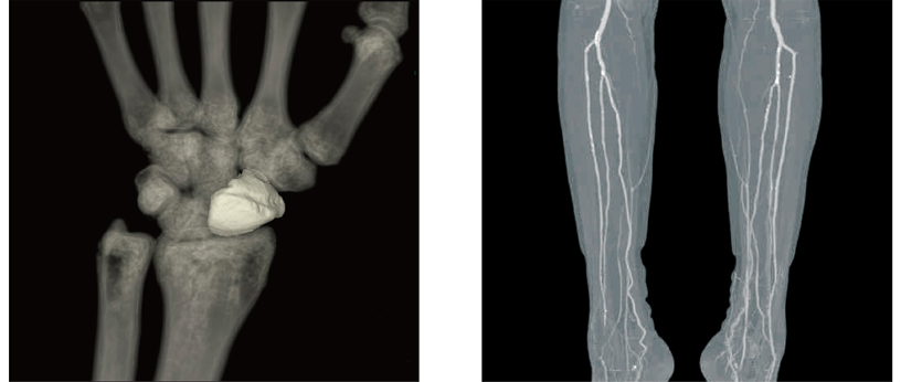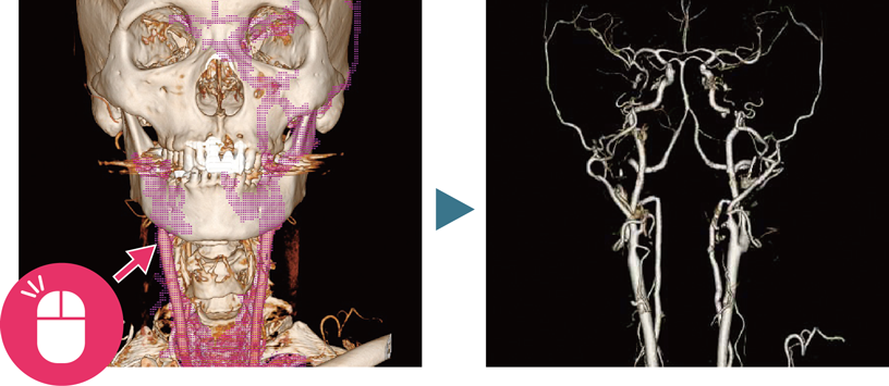 Bones are extracted or removed with one click based on the CT value and the shape of the region of interest recognized by REiLI technology.