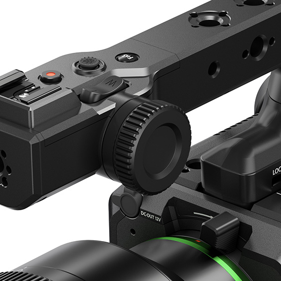 • Multi-function dials on the front of the camera and bundled handle enable control of “focus”, “zoom”, and “iris” of FUJINON G mount lenses. When set to “ND”, precise density adjustment of electronic variable ND filter is possible via dial control.