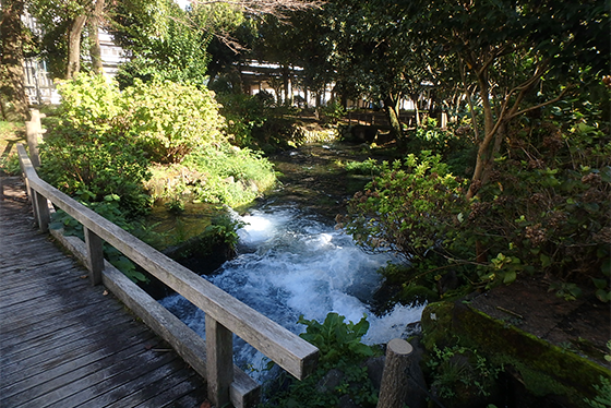 Within our Fujinomiya factory, cool, refreshing spring water originating from Mount Fuji emerges from multiple locations and flows into the Shimizugawa River.