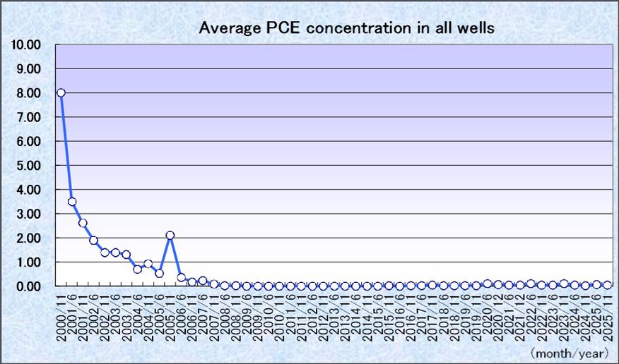 - Results of the aforementioned measures showed an average tetrachloroethylene concentration value of 0.0428mg/L in all grounds observation wells (As of November 2025), to the environmental standard value of 0.01 mg/L.