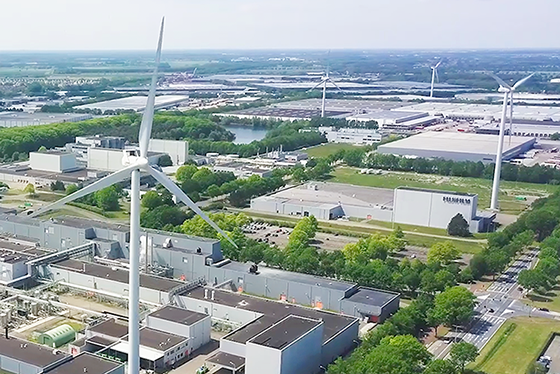 写真用カラーペーパーや、バイオ医薬品の研究開発・製造における細胞培養に不可欠な培地などの製造、および複合機のトナーカートリッジの回収・再生を行う、オランダ・チルバーグ市にあるFUJIFILM Manufacturing Europeでは、再生可能エネルギーの1つである風力発電由来の電力で使用電力のすべてをまかなっています。具体的には、2011年に敷地内に設置した5基の風力発電機を通じて35%の電力を確保(2024年度実績)。残りの65%についても、風力発電事業者から供給を受けています。