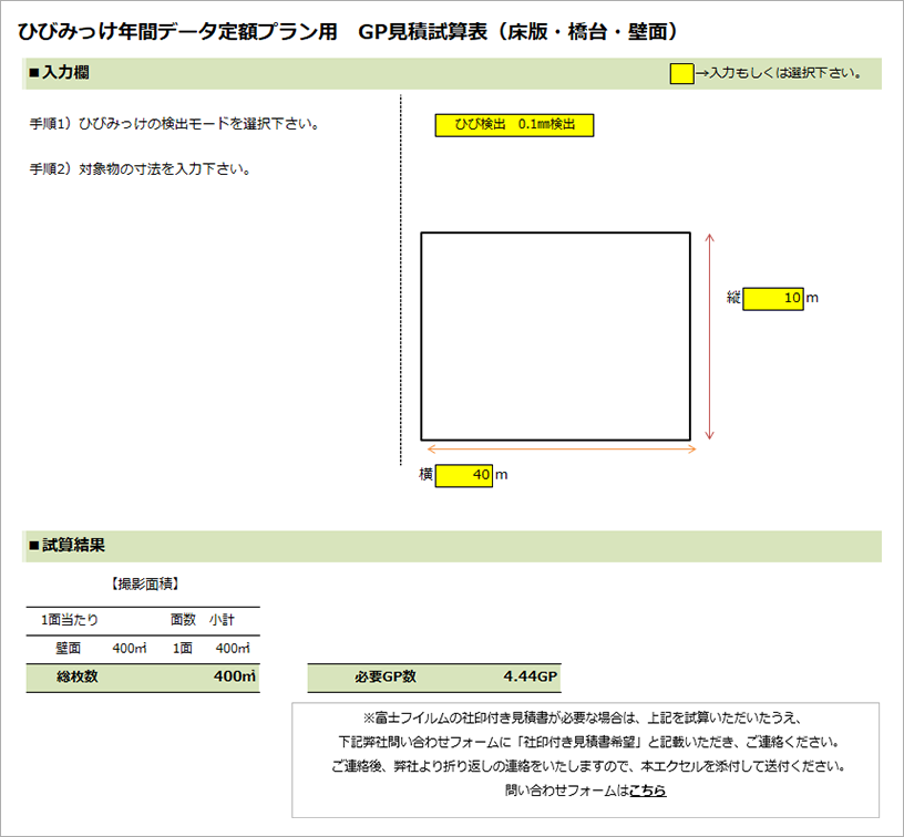 以下のエクセルに撮影対象の縦と横の構造物の大きさ(m)とカメラの画素数を入力いただくと、枚数・金額のご試算が可能です。