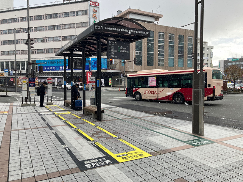 バス停サイネージのみならず、バス停周辺の路面標示や看板もリニューアルしたことで、山形駅東口広場全体の表示とカラーが統一され、駅前広場全体の待合環境・乗換環境が快適になりました!活気あふれる山形駅東口からぜひ公共交通機関をご利用ください。