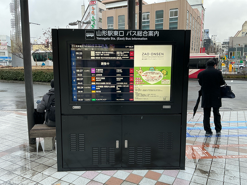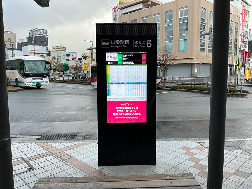 昨年度、山形駅西口・道の駅・山形市役所でのMORA導入に続き、山形駅東口駅前広場で7台の運用を開始しました。拡張機能として、高解像度ディスプレイ・音声発出機能・発車案内の先発便拡大機能などが搭載されました。
