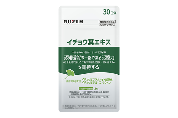 「イチョウ葉エキス*1」に含まれるイチョウ葉フラボノイド配糖体とイチョウ葉テルペンラクトンには、中高年の方の加齢によって低下する認知機能の一部である記憶力(日常生活で生じる行動や判断を記憶し、思い出す力)を維持する機能があることが報告されています。