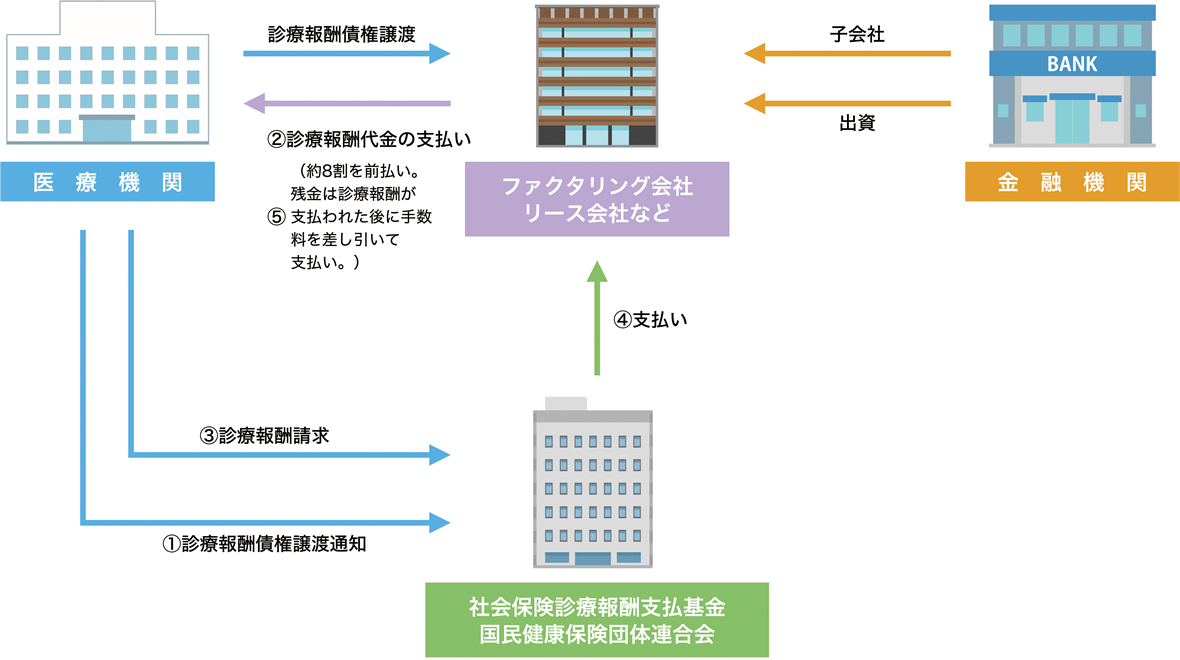 診療報酬債権流動化には様々な手法(特別目的会社を設立する方法、債権を信託銀行に信託する方法など)がありますが、手軽で代表的な手法が診療報酬債権ファクタリングです。