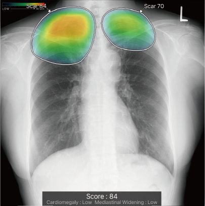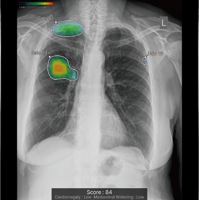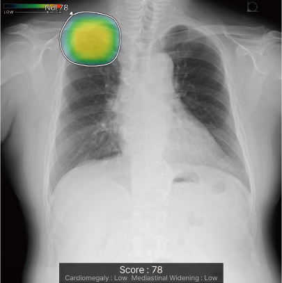 CXR-AIDが候補領域の解析をおこなったのち、0~100に応じた確信度を色分けして表示。