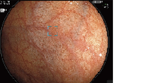 富田氏 大腸内視鏡において見落としやすいとされるのは、フラットな病変と微小病変の二つです。まだ検証段階ではありますが、CAD EYEは、そうした見落としやすい病変について多少遠くからでも検出してくれるという感覚があります。また、検出音や画面表示についても違和感がなく、病変を囲んで表示する水色の枠は、粘膜の色調とのコントラストで視認しやすいと感じています。