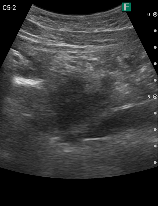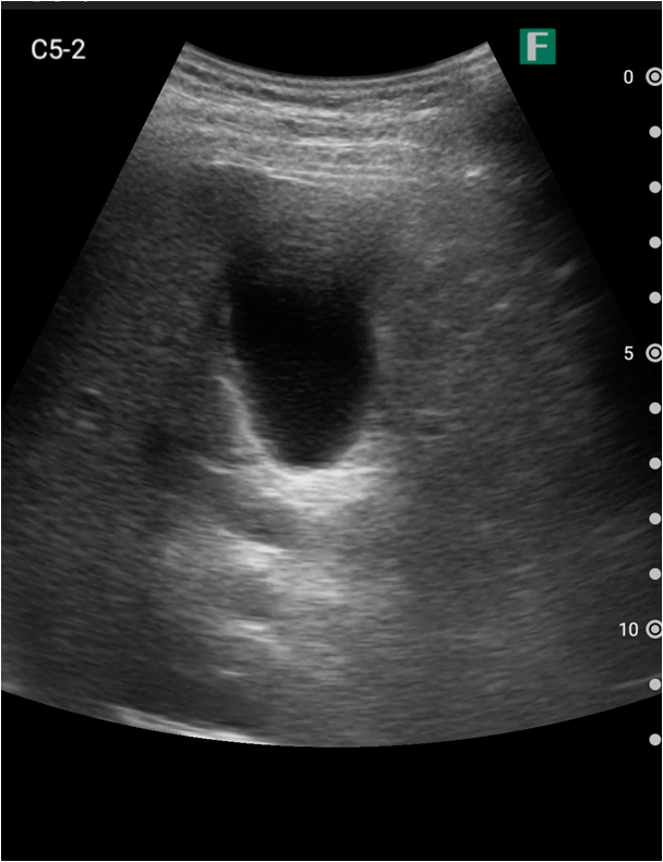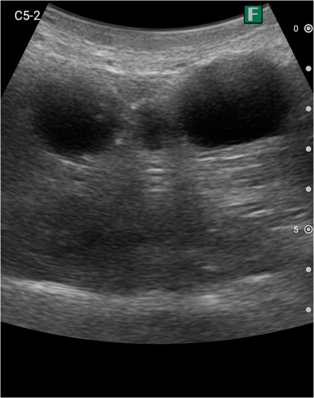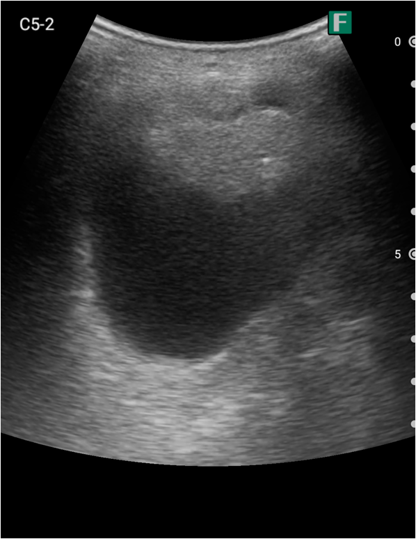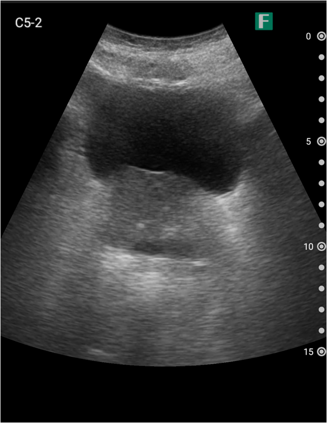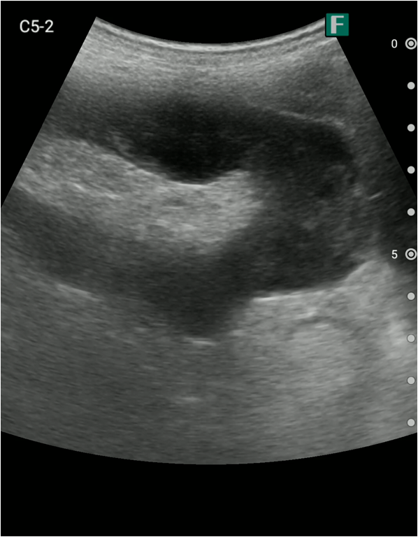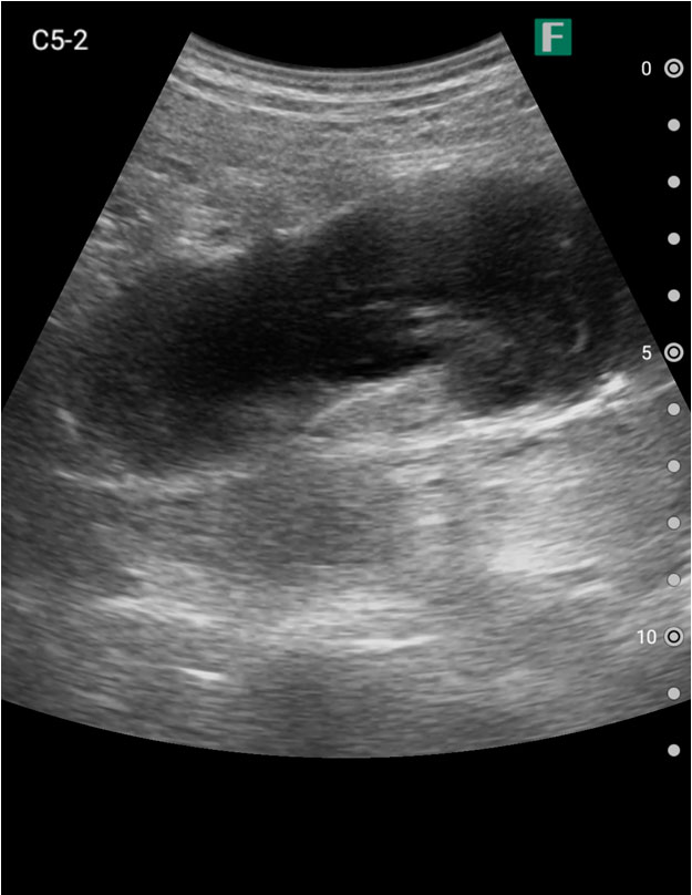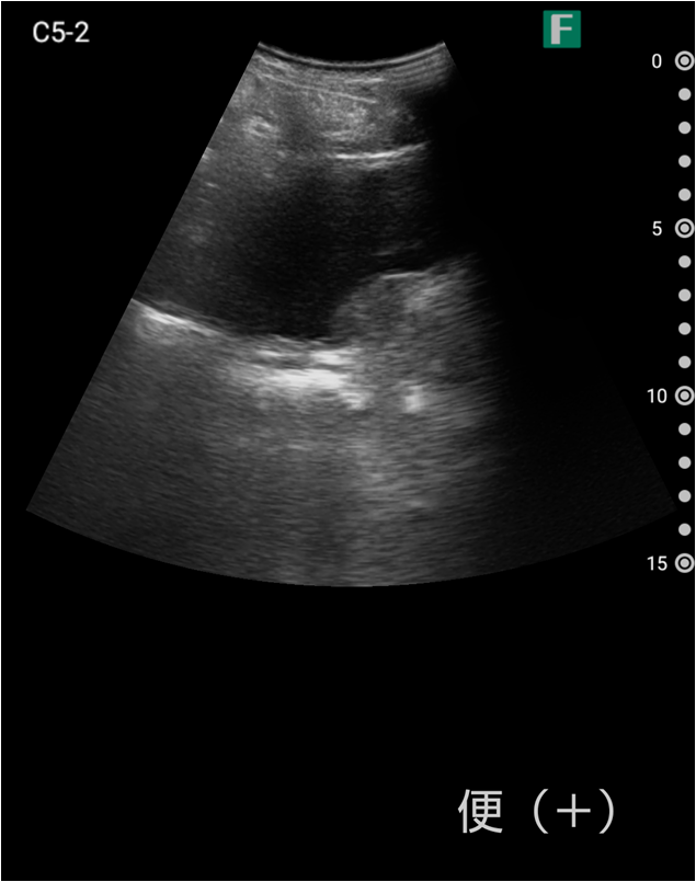視診を行い下腹部に軽度の膨隆が確認できましたが体外から出ているカテーテルには明らかな閉塞を認めませんでした。そこで、iViz airで観察したところ、膀胱内に約400mlの残尿を認めカテーテル閉塞による腎後性腎不全と診断を確定させることができました。尿道カテーテルを抜去した際、外見からは見えないカテーテルの先端部分に沈殿物を認め、閉塞の原因であるとわかりました。その後尿道カテーテルの交換を行うと残尿の排出ともに腹痛は消失し、無事に帰宅されました。iViz airでの観察が尿閉の確定診断につながった症例です。