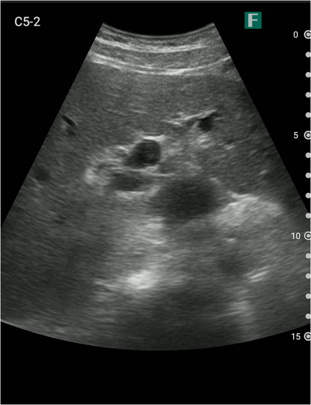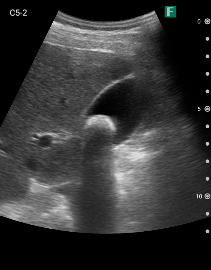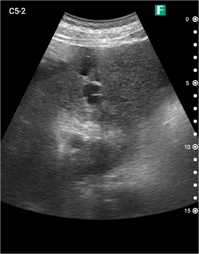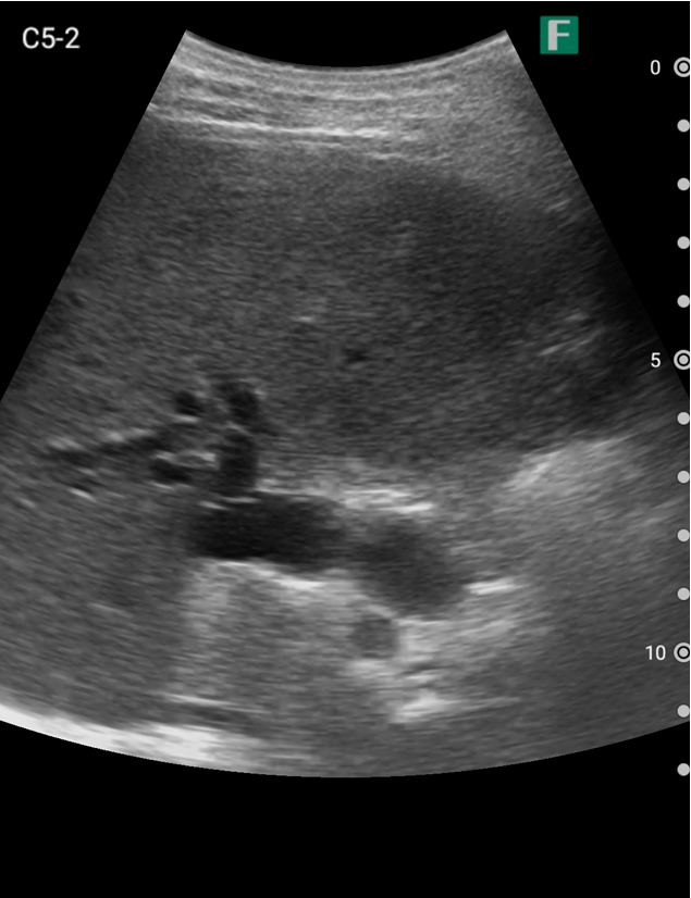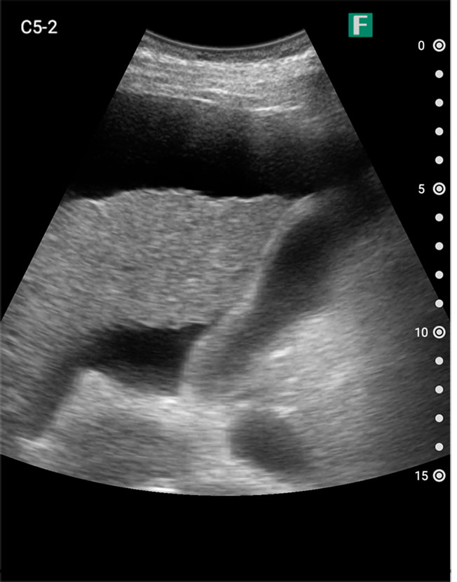 もう一つは入院患者様に対しての具体的な使用事例を紹介します。朝の回診の際にiViz airを使用し、例えば腹水のある患者様を診た際は、「今日は水の量が少なく、そこまでお腹は張ってないですね」、「今日はここに水が溜まっているんですけど、昨日より少ないですよ」など、日々の状態を患者様ご本人に伝えるようにしています。スマホで実際の画像も簡単にお見せできるので、患者様に実際に見ていただくことで少しでも不安を和らげてもらえるように心がけています。