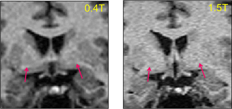 図5 0.4テスラ装置と1.5テスラ装置の線条体領域の灰白質・白質コントラスト(3DGEIR)