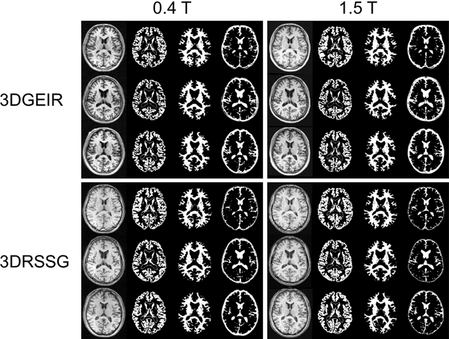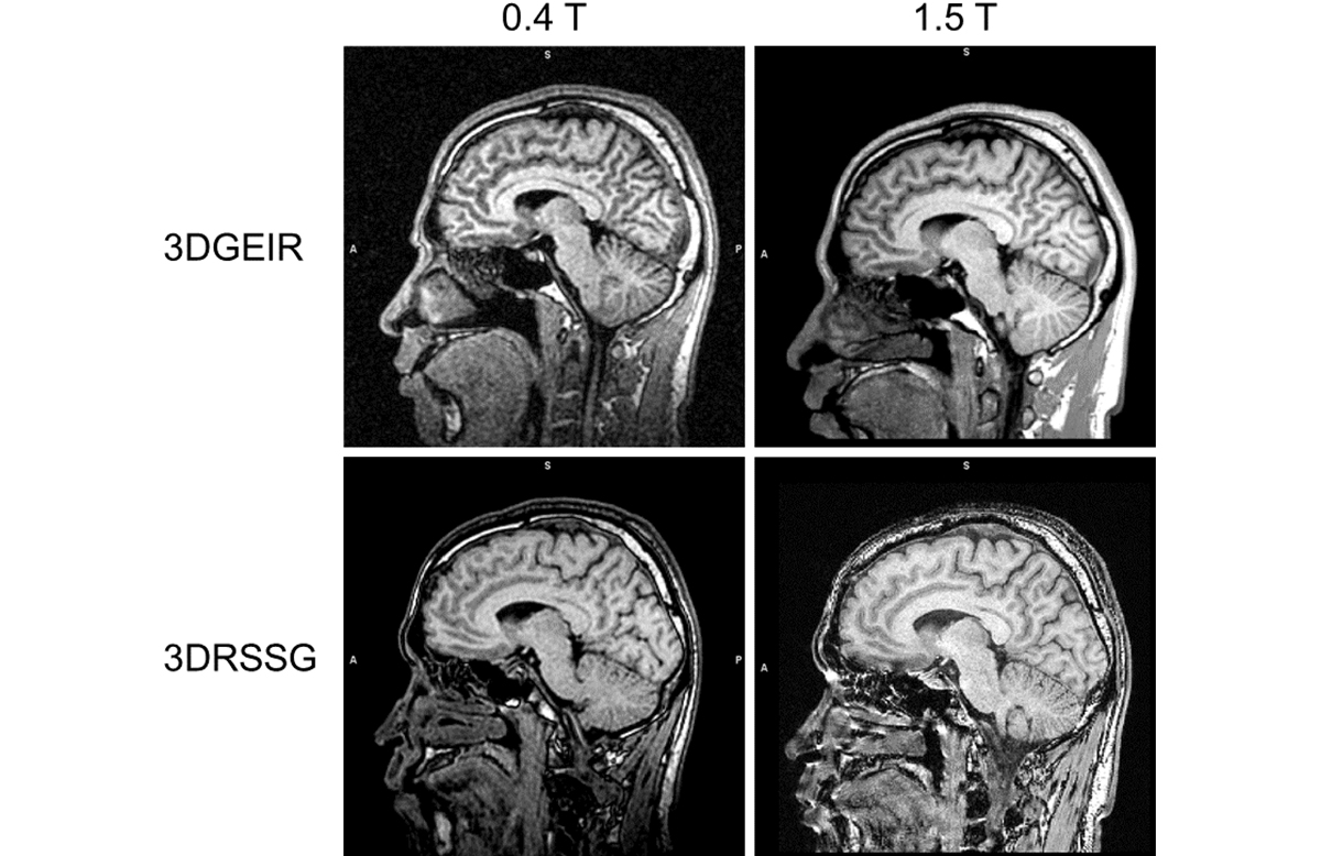 この最適化した撮像シーケンス・パラメータを使用し、同一ボランティアで0.4テスラ装置(APERTO Lucent*1)と1.5テスラ装置(ECHELON OVAL*2)で3D T1強調画像を撮像した例を図1に示す。VBMで一般的に用いられる組織自動分離抽出結果を利用して灰白質・白質・脳脊髄液の信号コントラストを算出すると、3DGEIRでは0.4テスラのボランティア3例の平均で白質・灰白質コントラストが1.63、脳脊髄液・灰白質コントラストが0.33となり、小数例での検討ではあるが1.5テスラの1.39と0.39と比較してむしろ高いコントラストを有することが示された。3DRSSGでは0.4テスラで白質・灰白質コントラストが1.35、脳脊髄液・灰白質コントラストが0.55となり、1.5テスラの同シーケンスではそれぞれ1.29と0.50であったため、ほぼ同等のコントラストが得られていることが確認できた。