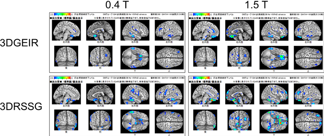 図3 0.4テスラ装置と1.5テスラ装置による3D T1強調画像のVSRAD解析結果(上段:3DGEIR、下段:3DRSSG)