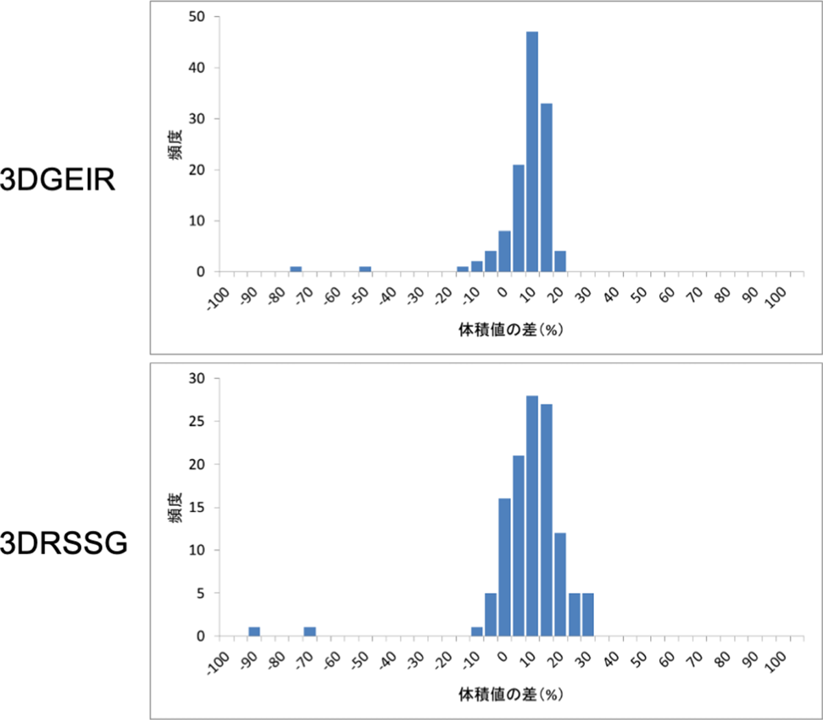 図4 0.4テスラ装置と1.5テスラ装置による解剖学的脳領域の体積差(1.5 T-0.4Tを1.5Tで除したもの、単位 %)。上段:3DGEIR、下段:3DRSSG)