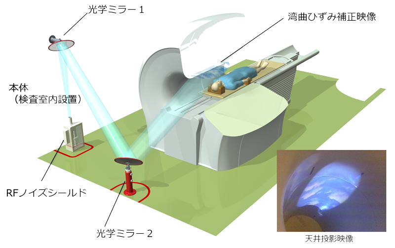 三瓶氏:頭部撮像で映像を検査中に見せるためには天井投影が望ましいのですが、整形検査などではボア内に視界が無く、映像投影の効果が得られないことがあります。そこで、同様のシステムを使用してボアの側面に映像を投影するバリエーション装置も製品化しました。これは、MRI検査前の被検者の不安感を低減することが期待できます。