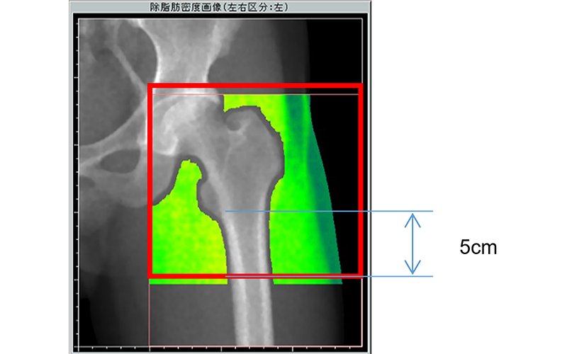 骨密度装置での体組成範囲は、大腿近位部(小転子下5㎝まで)(図2)とし、測定側大腿骨頚部にインプラントがある、下肢動脈に石灰化がある、測定体位をとれない、医師または測定技師が測定不可と判断した者は除く。