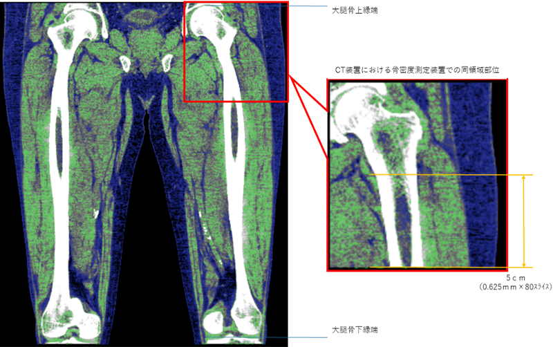 図3 CT測定範囲(大腿部全体と骨密度測定装置での同領域部位)