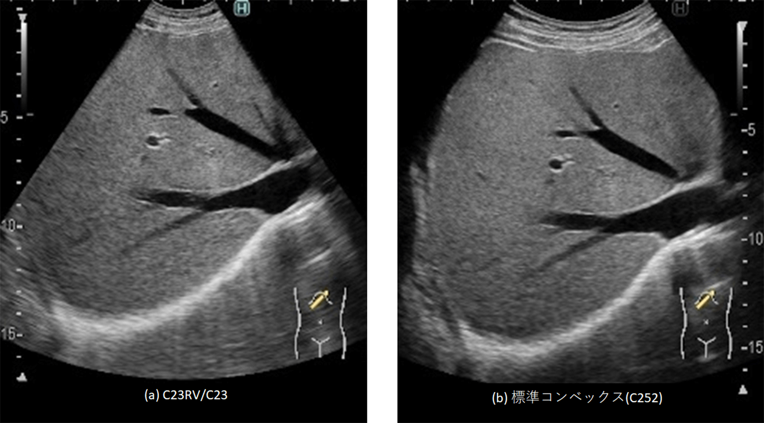 マイクロコンベックスプローブは小さな形状による取り回しの良さが特長であり、超音波ガイド下における経皮的ラジオ波焼灼療法(RFA:Radiofrequency Ablation)や生検を施行する際に用いられている。しかしながら、マイクロコンベックスプローブは小さな形状による制約により、標準コンベックスプローブに対して画質が劣るという課題があった。そのため、標準コンベックスプローブからマイクロコンベックスプローブへ持ち替えた際に画質の差異が生じていた。
