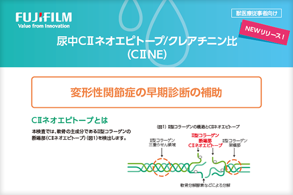CⅡNEは変形性関節症の早期診断の補助として有用な尿検査項目です。本資料にはCⅡNEの測定意義や結果の評価とアクション、検査に影響を与える要因、CⅡNEを用いた運動器検診のご紹介を掲載しています。 監修:日本大学 生物資源科学部 獣医学科 獣医外科学研究室 教授 枝村一弥 先生