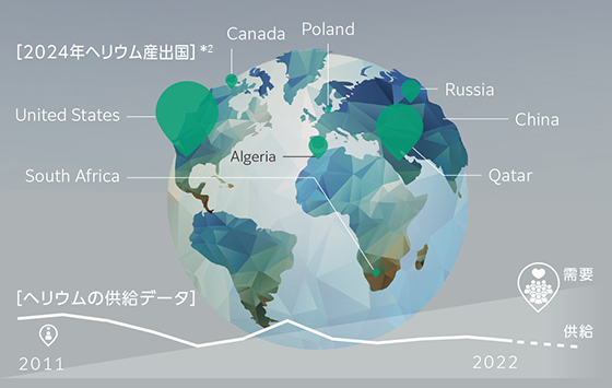 ヘリウムは、地球上にごくわずかな量しか存在せず、採取可能な量も産出国も限られています。先端医療や産業に欠かすことのできないヘリウム。その需要は年々増え続け、供給とのバランスが崩れつつあります。