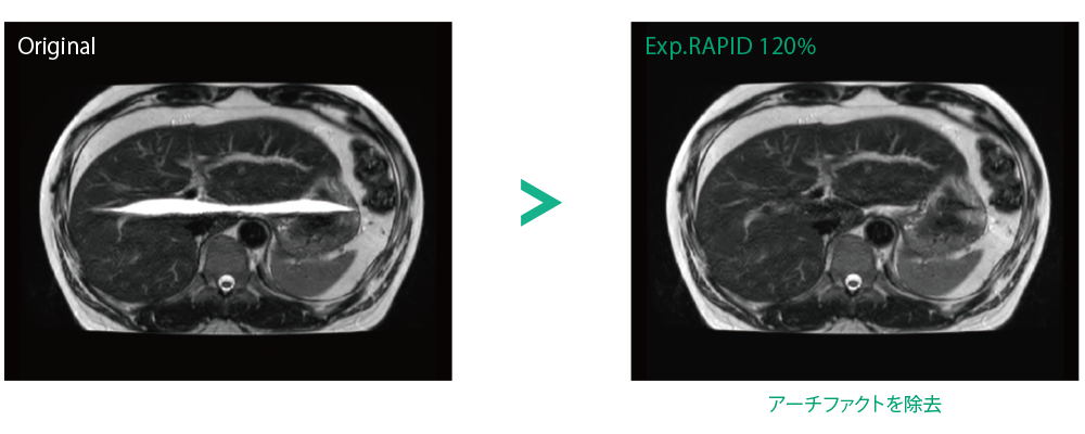 位相エンコード方向のサイズを誤って設定した場合、FOV外の信号に折り返しが生じ、画像にアーチファクトとして現れます。Exp.RAPIDは、指定したFOV拡大率に応じて画像を再構成。後処理で、アーチファクトを除去することも可能です。