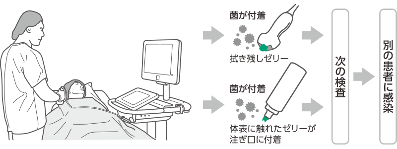 検査後の超音波プローブの清掃や消毒が不十分な場合に、プローブに残ったゼリーが汚染され感染につながるリスクが考えられます。