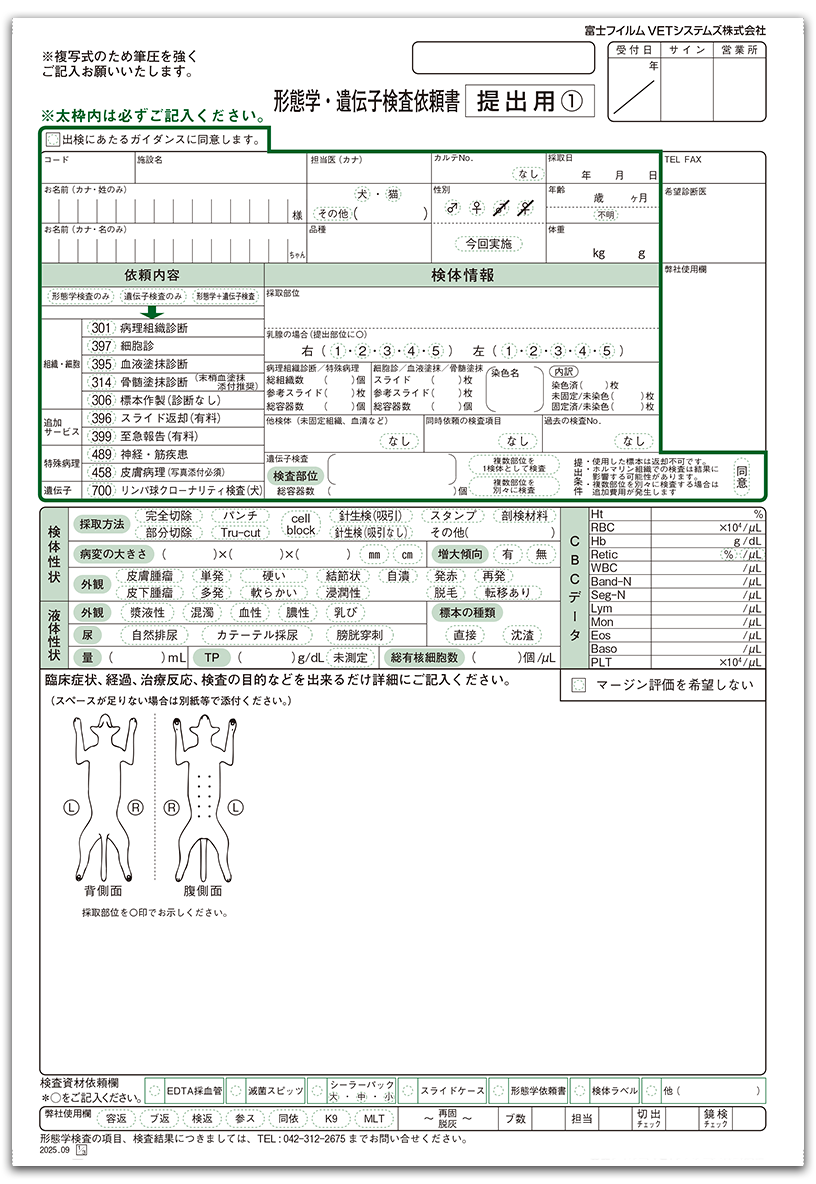 形態学検査依頼書をご利用ください。依頼書には臨床情報をご記入いただき、『患部写真』と一緒にご提出ください。