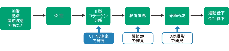 CⅡネオエピトープは軟骨の変性とともに血中や尿中に放出されるため、運動器に関連した徴候がない早期の段階で適切なOAの検査につなげることができます(図2)。