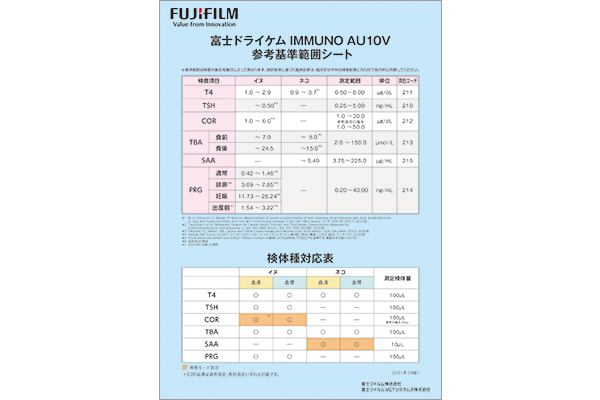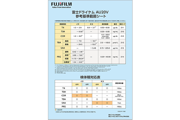 シンプルな操作でT4、コルチゾール、ネコのSAAなど多彩な項目の測定を実現させた「富士ドライケム AU20V」のカタログ。各種機能の特徴や、各項目のカートリッジ情報をまとめています。