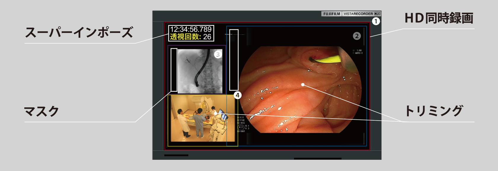 4系統の信号をすべてをHD解像度で同時録画。①PinP合成、②メイン画像、③サブ画像、④ビデオカメラ(室内カメラ)