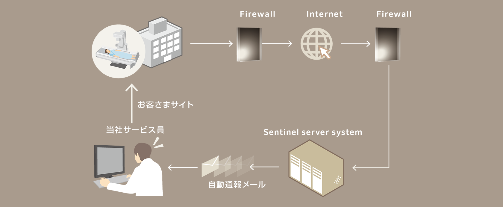 Sentinelサーバが装置異常によりエラーを検出した場合、当社サービスサイトにアラートが自動通報されます。これにより故障発生をいち早くキャッチし、迅速に対応いたします。