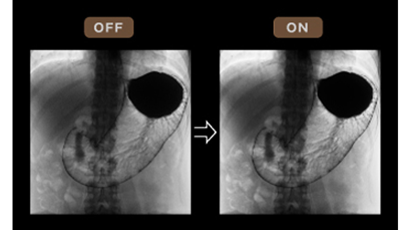 Retinex理論に基づき、透視画像の局所ごとにコントラスト補正を行うことにより、低コントラスト帯の視認性を向上する技術です。 椎体・ハレーション部における、胃との重なり部分の視認性が向上します。M-DRCと処理と組み合わせることで、より効果的です。