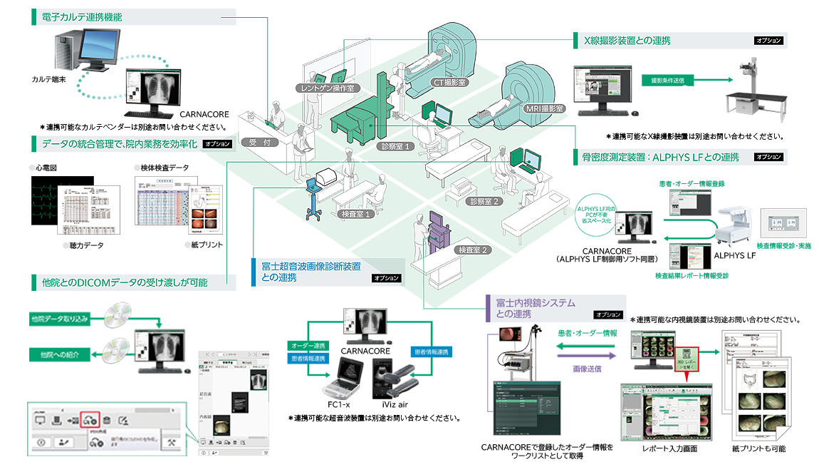 CARNACOREは、各種モダリティと連携しながら、レントゲン画像をはじめとするさまざまな検査情報に対して一元管理、画像処理などを行い、閲覧を可能にするクリニック向け画像診断ワークステーションです。