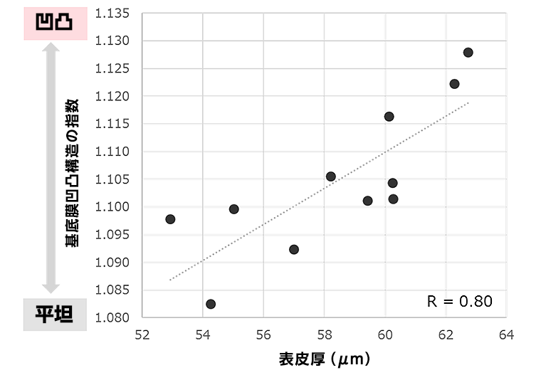 さらに当社は、キメの皮丘部の皮膚厚みに着目し、基底膜の凹凸構造の上層にある皮膚(表皮)の厚みを測定しました。その結果、基底膜の凹凸構造が集中している箇所では皮膚が厚いことが明らかになりました(図4)。一方で、皮溝部では凹凸構造と皮膚の厚みに相関がないことが分かりました(データ不掲載)。本結果は、老化に伴い基底膜の凹凸構造が平坦化することで、皮丘部の皮膚が薄くなり、キメが失われる可能性を示唆するものと考えられます。