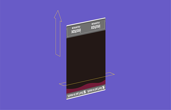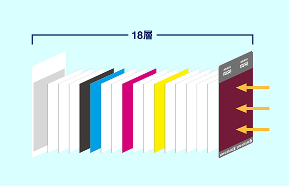 instax™フィルム(以下、フィルム)には銀塩写真としてプリントができあがるまでの仕組みが詰め込まれています。instax™“チェキ”のカメラで撮影すると、カメラのレンズを通った光がフィルムの裏から当たり、露光が始まります。厚さわずか数十マイクロメートルのフィルムには、さまざまな役割を持った18もの層がまざることなく薄く塗布されています。カメラからフィルムが出てくるときにフィルム内に封入された現像液の袋が破れ、緻密に設計されたカメラのローラーが、現像液をフィルム全体に均一に伸ばし、化学反応によって現像が進みます。現像が始まってから画像が浮かび上がるまでの約90秒の間に、露光した光の色によってフィルム内の異なる色の層が反応し、重なりあって狙いどおりの色を表現します。当社が長い年月をかけて積み重ねた技術で、チェキプリント™の美しい色と高精細な画質を実現しています。