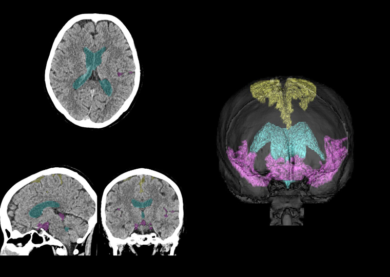 今回、富士フイルムと名古屋市立大学は、富士フイルムの「SYNAPSE Creative Space」を用いて、頭部CT画像上でDESHに関係する脳脊髄液腔の各領域(高位円蓋部・正中のくも膜下腔、シルビウス裂・脳底槽、脳室)を抽出するAI技術を開発しました。昨年MRI向けに開発した技術を、MRI検査と比べて検査時間が短いことなどから医療現場で広く普及しているCT検査向けに発展させたものです。本技術は、頭部CT画像上でDESHに関係する各領域のアノテーション作業を効率的に行い作成したデータをAIに学習させて開発したもので、CT画像上で脳脊髄液腔の各領域を抽出できます。さらに、領域ごとの体積や領域間の体積比を算出することにより、脳萎縮とハキム病の判別に重要な画像所見であるDESHの判定に大きく寄与し、ハキム病の診断精度向上につながることが期待できます。