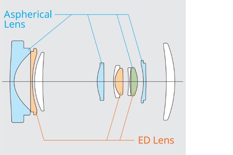 Lens constractions: 10 elements in 9 groups, including 4 aspherical and 3 ED lenses