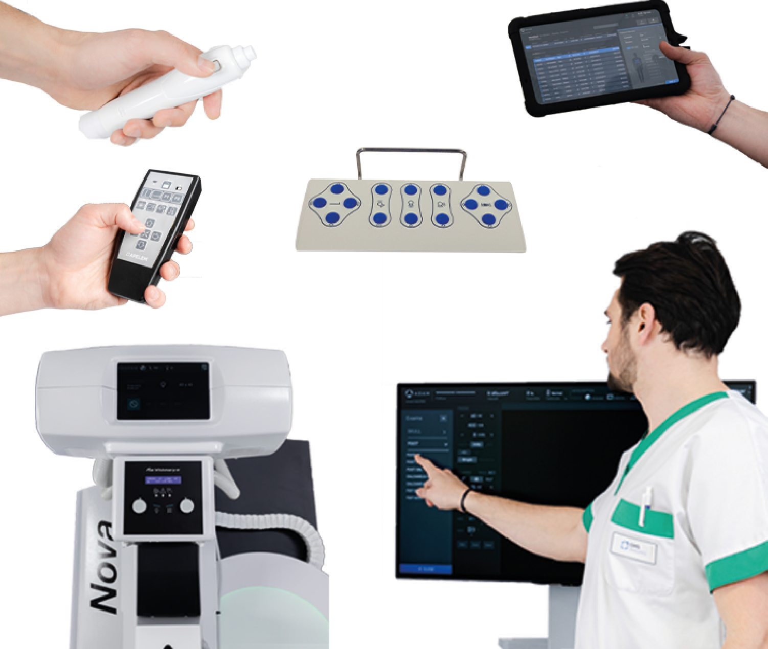 IIn addition to the control console, innovative solutions have been developed to improve operator workflow, such as a control panel on the table, the recall of commands on the touch pad of the tube head, an IR remote control as well a BT exposure switch and 7-axis foot controls pad.