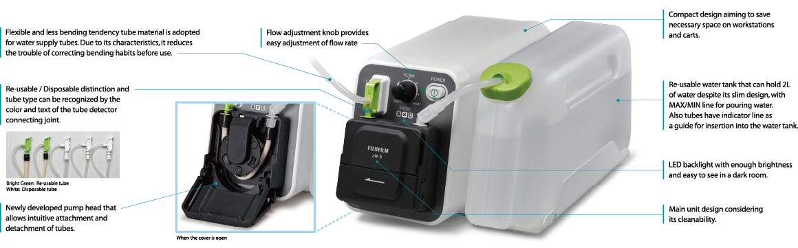 The drive of pump motor is controlled according to the detected tube.In addition, different water flow rates are designed for each tube with the aim of achieving both comfortable water response and stop performance and supporting endoscopic procedures.