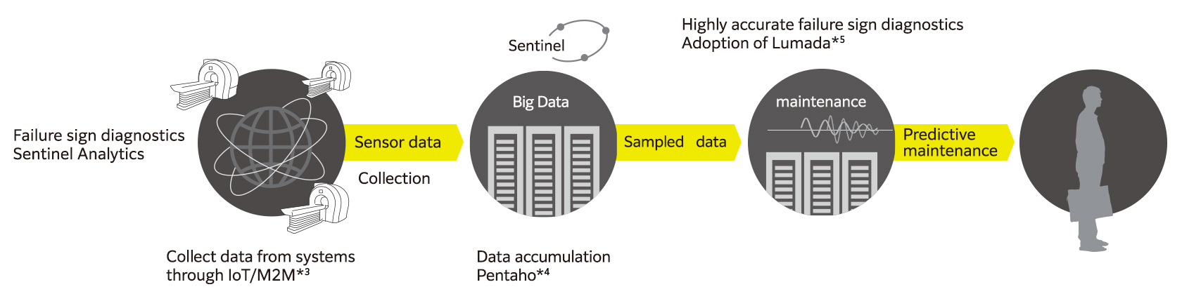 Achieving higher uninterrupted system availability and optimizing maintenance costs remain challenges for conventional remote support services for medical devices. We have accumulated and analyzed Big Data to develop a new system that utilizes its "Failure Sign Diagnosis Service" to launch "Sentinel Analytics," a failure sign diagnostic service for superconductive MRI systems.