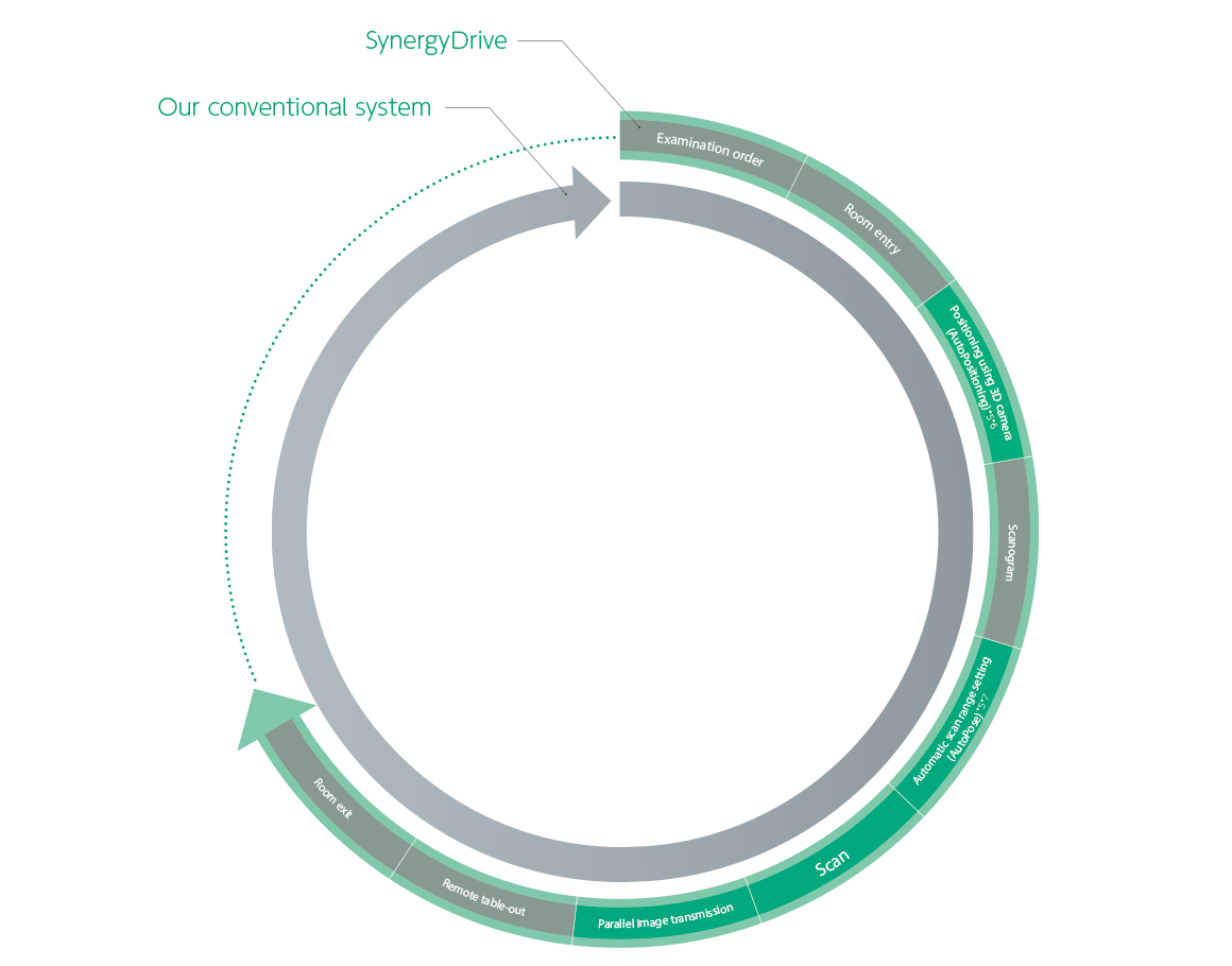 The image processing technology that Fujifilm has cultivated to date is also installed in the Operating Console of our CT system, enhancing the analysis functions. By simultaneously storing the reconstructed images in the Operating Console of our CT system and transferring them in parallel to SYNAPSE 3D,  the waiting time from the end of the scan to the start of analysis can be shortened.