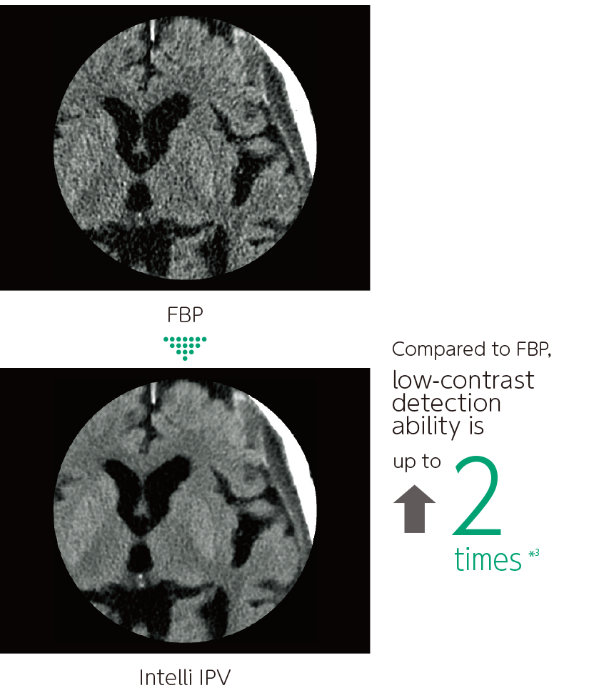 • *2 Compared to FBP. It was measured using Intelli IPV intensity level Strong5 and tested to a water phantom. Depending on the clinical task, patient size, anatomic location, and clinical examination, the effect obtained may be smaller.