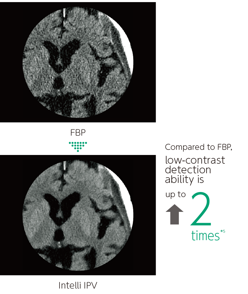 - *4 Compared to FBP. It was measured using Intelli IPV intensity level Strong5 and tested to a water phantom. Depending on the clinical task, patient size, anatomic location, and clinical examination, the effect obtained may be smaller.