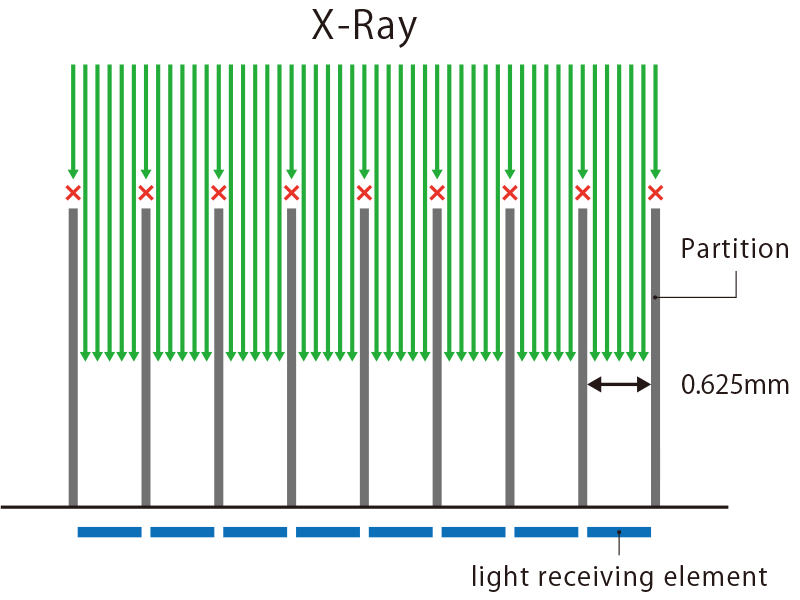The X-ray detector is separated by a partition. The X-ray utilization efficiency decreases by the thickness of this partition. There is a trade-off between X-ray utilization efficiency and spatial resolution, and a detector with a minimum slice width of 0.625mm is equipped.