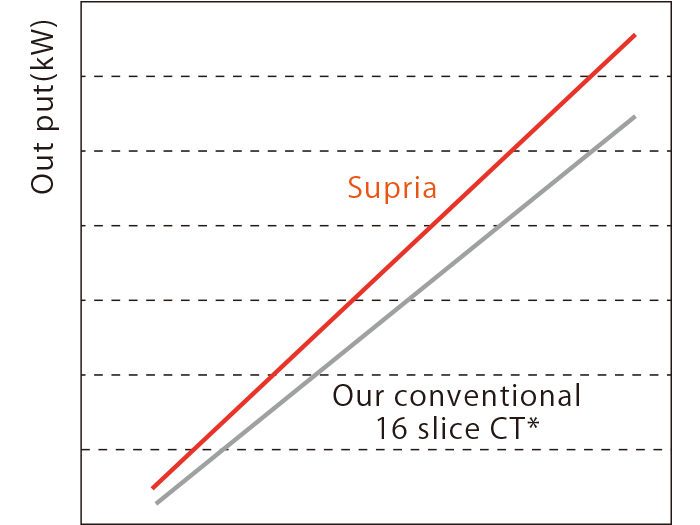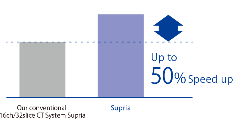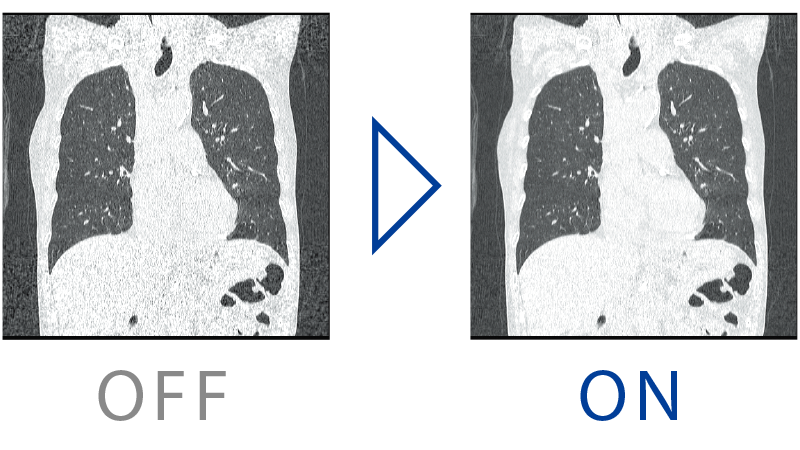 To use the iterative processing  (Intelli IP), a noise reduction  technology, more efficiently on  routine examinations,  reconstruction speed has been  improved by 50% compared to  the Conventional CT. In addition,  the intensity of noise reduction can be selected from seven levels, providing high quality images with appropriate exposure dose, image noise reduction and artifact reduction based on the operation guideline at clinical sites.