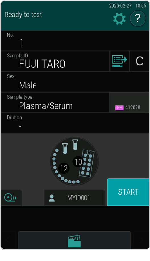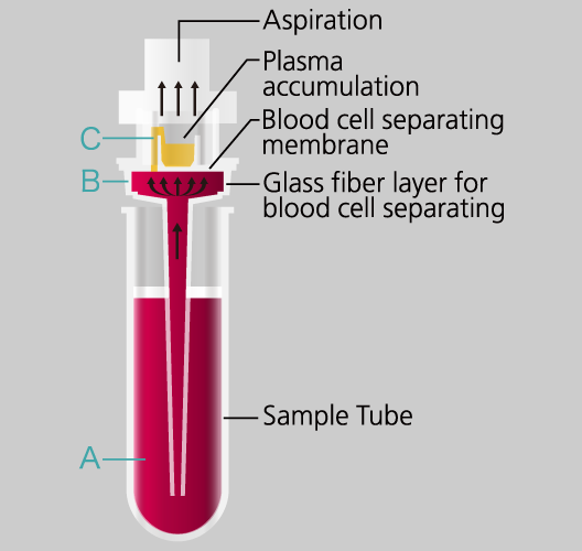 Plasma Filter (PF) can cut the turn around time and the pre-treatment process of the sample. It can generate a plasma sample by aspirating and separating the whole blood inside the PF within 1 minute. Just set the PF on top of the sample tube and press START.
