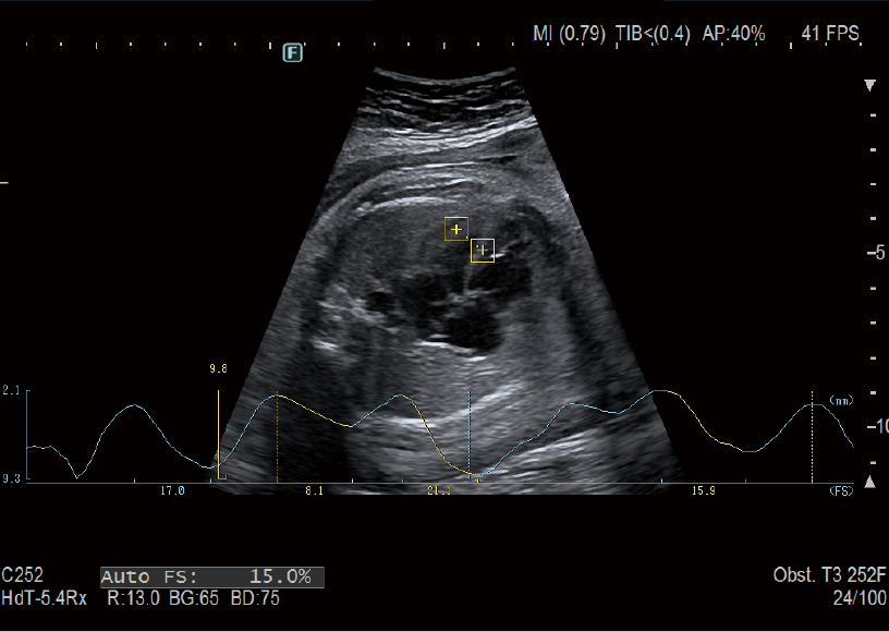 AutoFHR+ calculates the fetal heart rate automatically by tracking the movement of the fetal heart from a B mode image in real time. This function is available on both transabdominal and transvaginal transducers, so the fetal growth can be assessed from early gestation onwards. AutoFS tracks fetal heart movement from a B mode image and automatically calculates %Fractional Shortening (%FS). Unlike the M-mode method, AutoFS is not affected by a change in the fetal position, so heart movement can be measured.