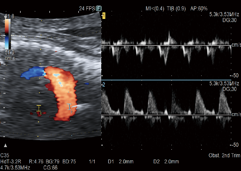 Enables the observation of Doppler waveforms from two different locations during the same heartbeat. The rhythm of atrial and ventricular systole can be evaluated more efficiently than single Doppler methods.