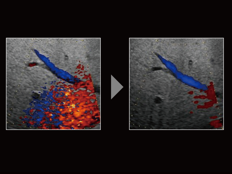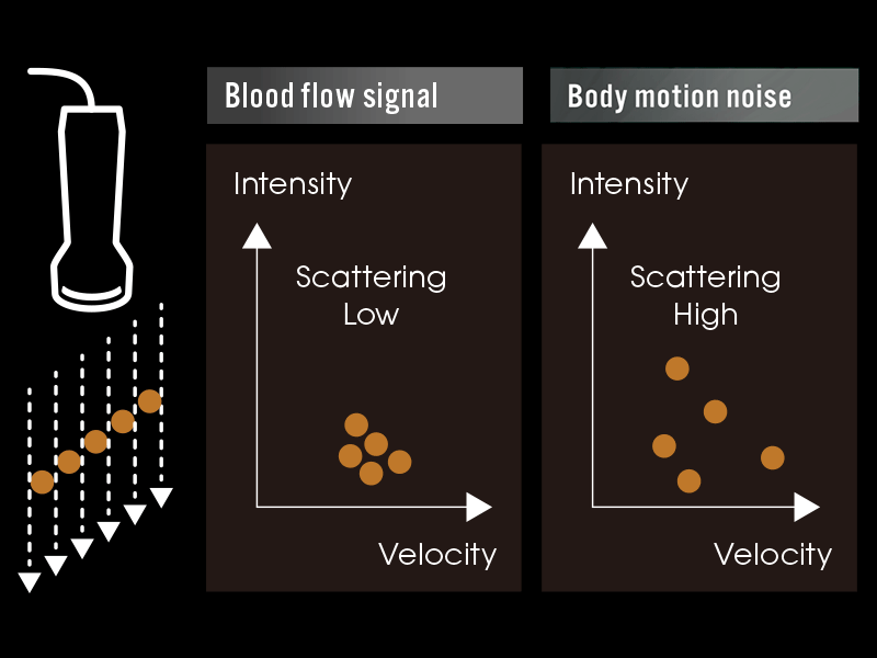 Detective Flow Imaging (DFI), which is a micro vascular flow imaging technology, has supported noise processing technology “Wall Motion Reduction PLUS” so that body motion noises are suppressed selectively, and images of high sensitivity and visibility can be realized. “Wall Motion Reduction PLUS” judges the scattering of detected signal intensity to perform noise reduction according to the body motion amount of each region.