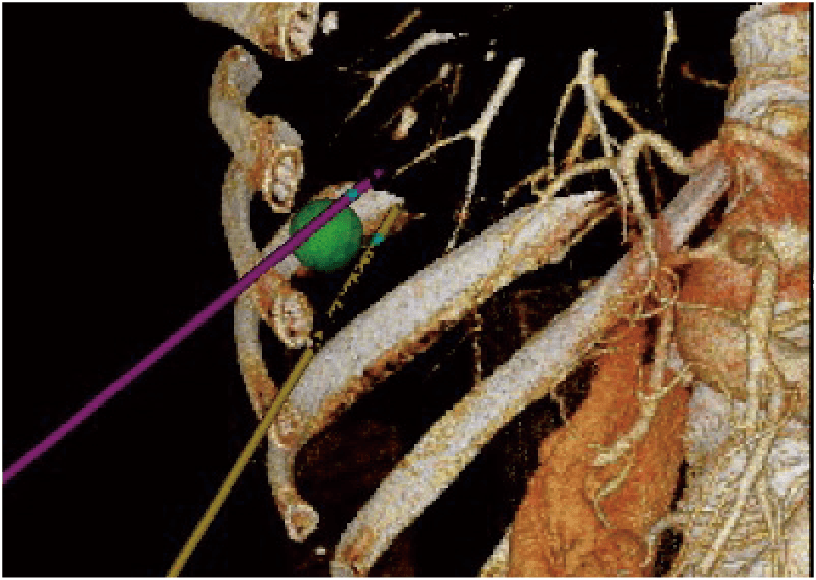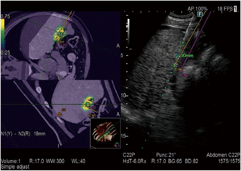 Provides simulation of single or multiple needle paths during navigation to a target with Real-time Virtual Sonography (RVS). The positional relationship between the marked target and needle paths can be assessed in real time using the 3D body mark and C-plane display. E-field Simulator superimposes the electric field (E-field) from the given location of electrodes on the CT image during RFA treatment. The simulation of E-field allows to consider an effective needle path.